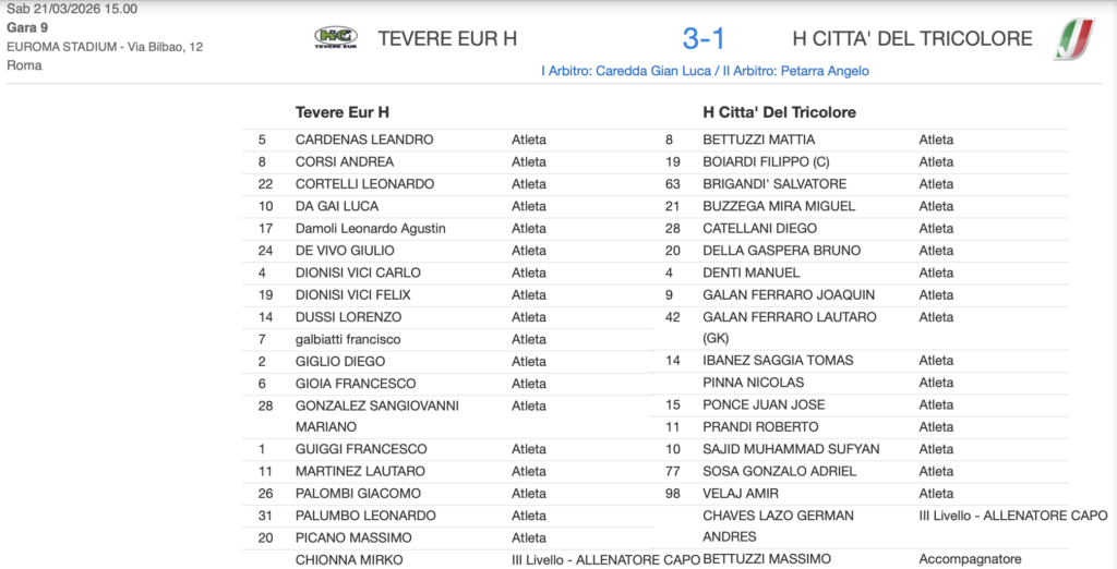 Ancora un successo casalingo per i campioni d’Italia in carica. La Tevere Eur supera la Città del Tricolore per 3 a 1 grazie alle reti di Felix Dioni Vici, Giacomo Palombi e Massimo Picano. Di Joaquin Galan la rete degli ospiti.